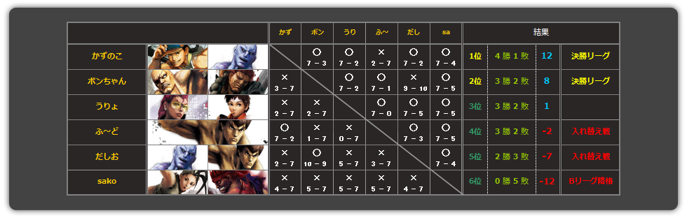 暫定順位 5位~10位 の6名による本戦下位リーグを行い、上位2名が本戦決勝リーグで待つ4名と入賞をかけて争うことになる。