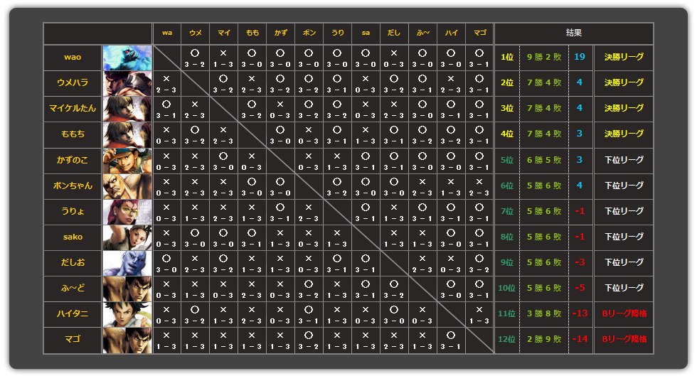 予選ステージでは全員参加の「暫定順位決定 総当たり戦」を実施。この時点で11位と12位の降格が確定!